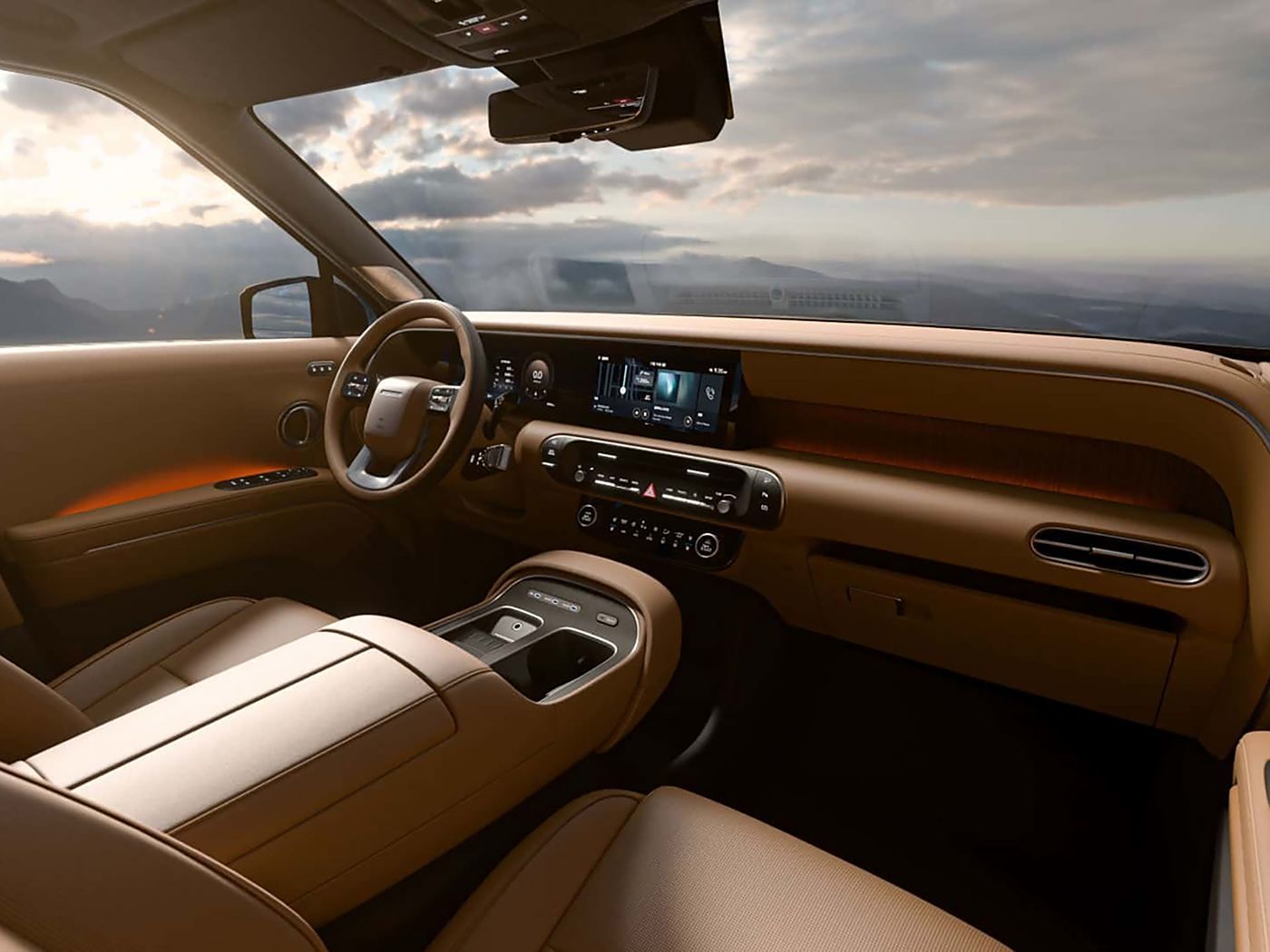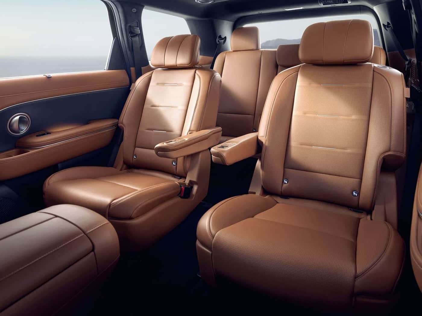 内饰上,现代帕里斯帝风格是主打“老派”豪华,仪表台有层次感,有物理按键,有大量的皮质包裹,同时有大尺寸的联屏,配置上有零重力座椅,有BOSE音响,而空间上则是有6座和7座可选。