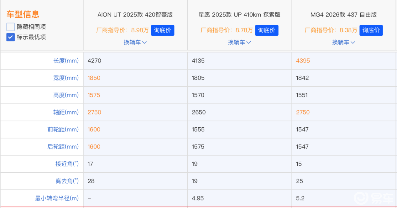 大家选择A0级小车,首先考虑的就是灵活性,所以车身尺寸并不能太大,两款车型的长度分别为埃安UT(4270mm)\吉利星愿(4135mm),都属于比较小巧的范畴。