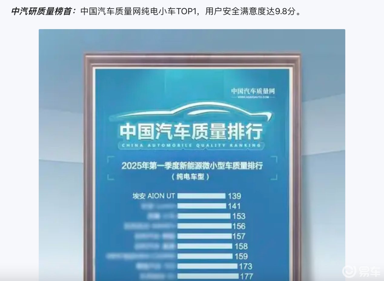 当然大家还需要关注的就是质量问题,毕竟这台车陪伴我们的时间短则三四年,长则七八年甚至更久。而两款车型都是大厂出品,其实大家都不用太担心质量的问题。但在纯电新能源领域,埃安品牌始终致力于纯电市场,已经创造了130万用户零自燃纪录,成为了安全可靠的代名词,并且在中汽研A0级纯电小车质量榜单里夺得TOP1的成绩。