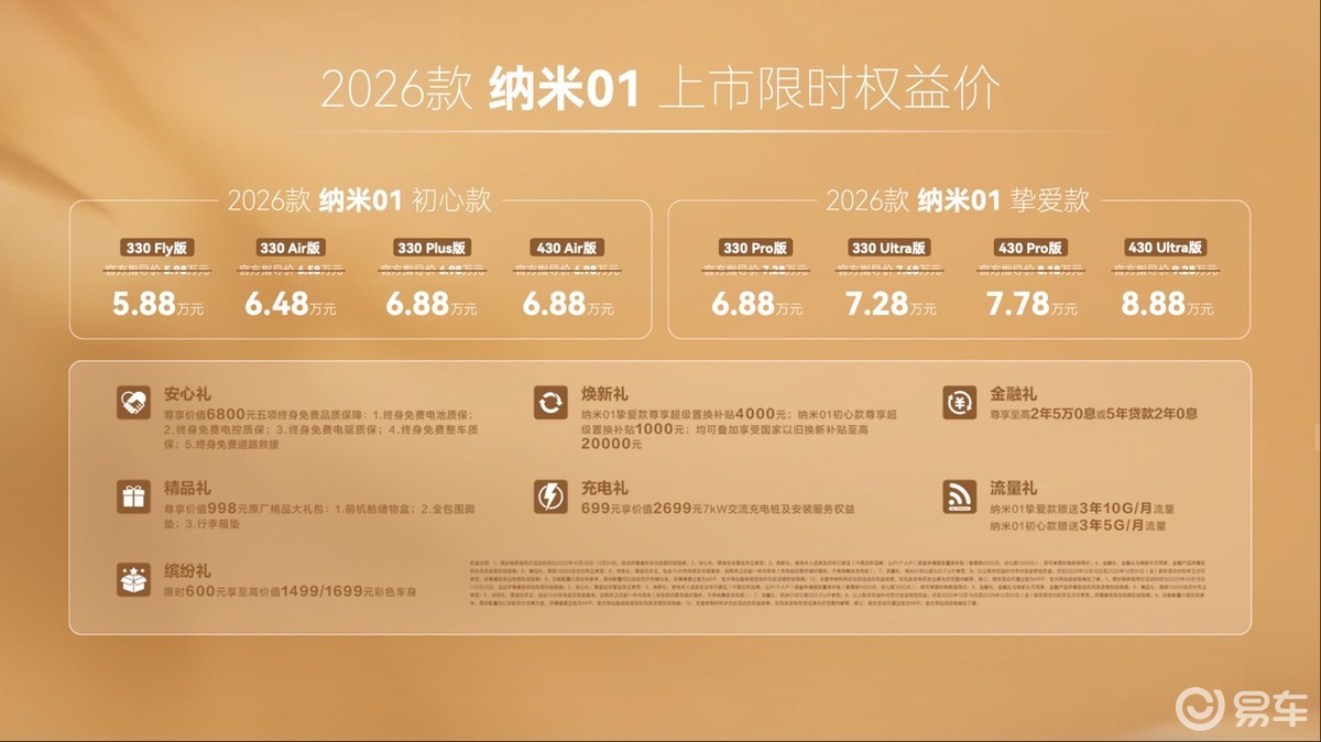 当价值远高于价格,是给予用户最大的诚意,也是纳米01面向市场最大的底气。新车特别推出「初心款」与「挚爱款」双版本共计8款车型,限时焕新指导价5.88-8.88万元,并且为用户准备了安心礼、金融礼、精品礼、缤纷礼等七重大礼。