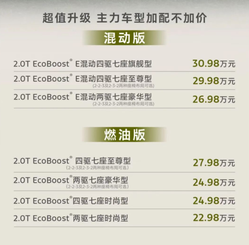 若要做对比,我们直接聚焦两款车的中配七座车型,看看哪款更值得入手。先看入门版本的基础差异:福特锐界 L 入门即 7 座车型,起售价 22.68 万元;而丰田汉兰达入门为 5 座车型,7 座车型起售价为 25.78 万元,两车的入门价差已比较明显。再看核心的中配七座版本:福特锐界 L 2.0T EcoBoost® 混动两驱七座豪华型,官方指导价 26.98 万元;丰田汉兰达两驱豪华 7 座,官方指导价则为 28.88 万元。