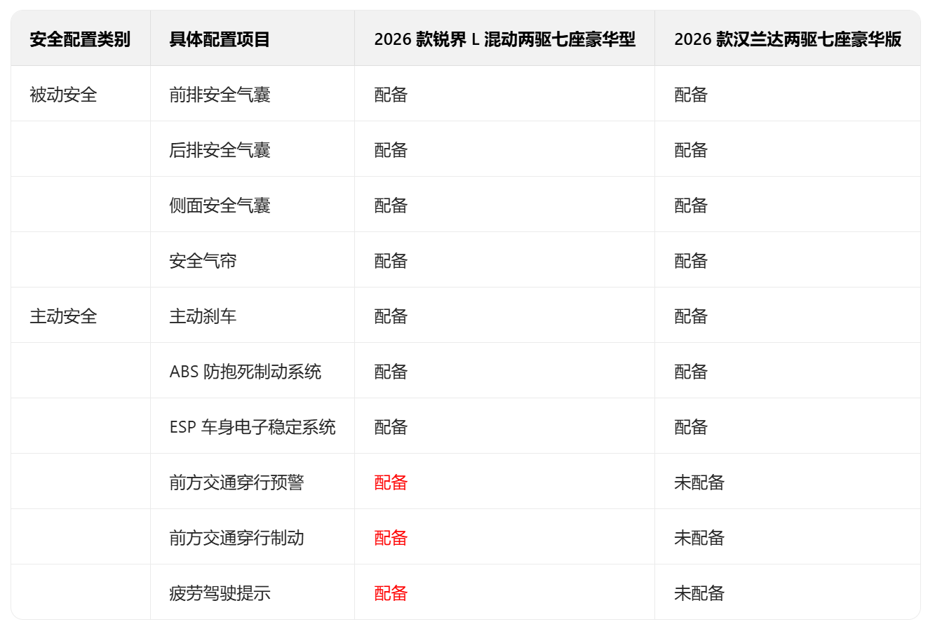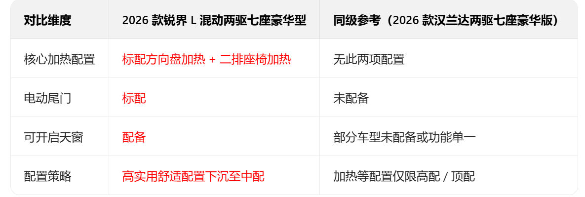首先我们从舒适性配置上进行对比:2026 款福特锐界 L 在舒适配置的搭载上注重实用性,配备了方向盘加热、二排座椅加热、电动尾门、可开启天窗等配置;汉兰达对应价位的中配车型暂未搭载这两项加热配置及部分舒适配置。