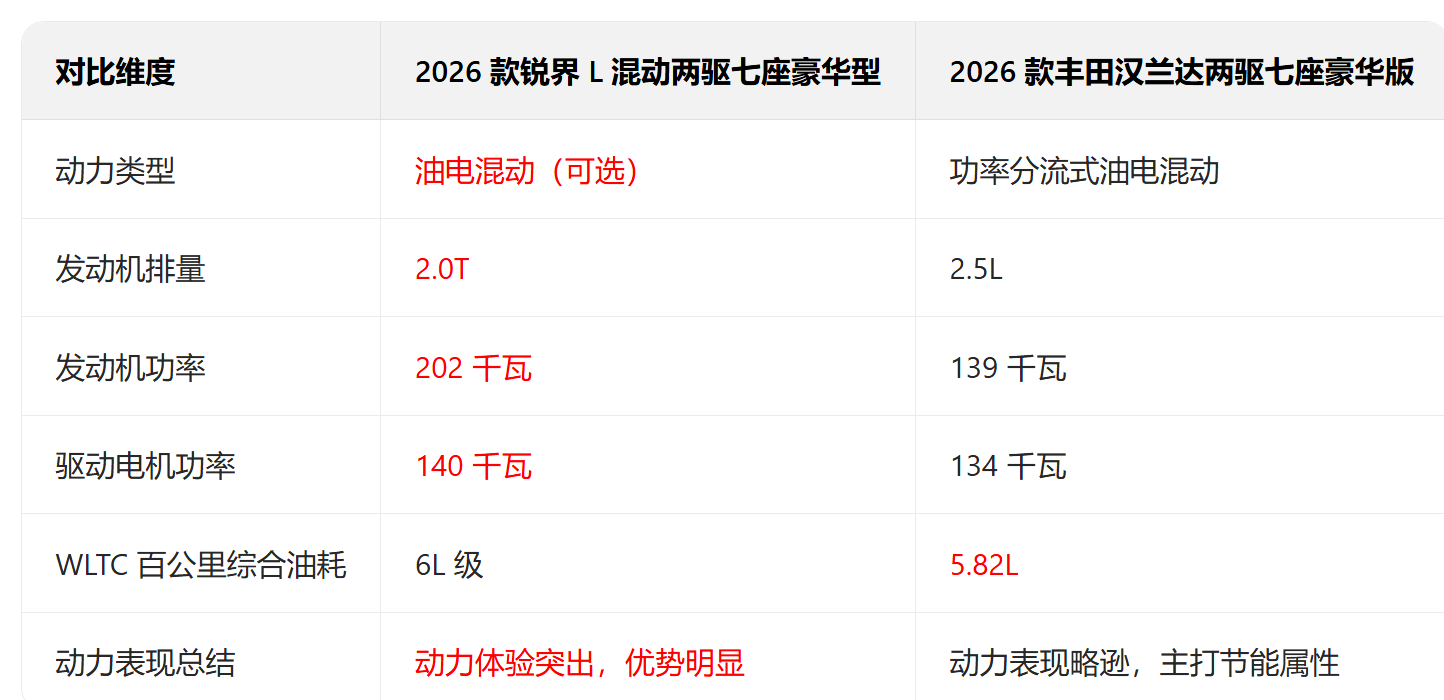 丰田汉兰达采用油电混动动力结构,具体为功率分流式混动。其中发动机为 2.5L 排量、139 千瓦功率,主打节能属性;电机部分则搭载 134 千瓦的驱动电机。从参数来看,丰田汉兰达的动力表现略逊于福特锐界 L 混动版,但两款车的产品取向不同:在油耗层面,丰田汉兰达的 WLTC 百公里综合油耗为 5.82L,福特锐界 L 混动版则为 6L 级,实际差距不大,基本都在 6L 左右。不过从动力来看,福特锐界 L 的优势会更明显 —— 毕竟这类大尺寸车型,谁都不希望开起来动力不足、体验拖沓。