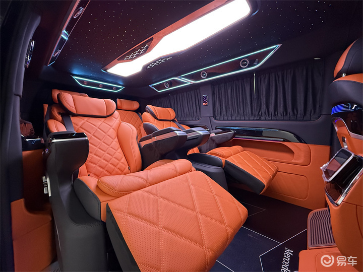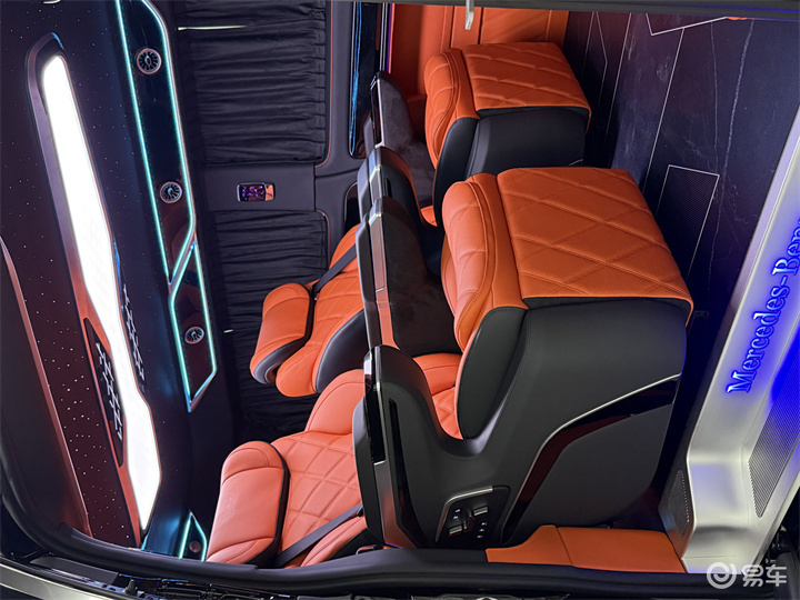 车里面非常的漂亮,整体的内饰用的是爱马仕橙的一个内饰,这个颜色搭配经典,就算过个几年打理的好,跟新的一样。那车内的基础配置,像顶部,侧墙,地板通通都做了更换,豪华的软包,一系列都有覆盖。标配了车内的大座椅,航空座椅和沙发床,通风加热按摩这些功能通通都有。日常的车内休息睡觉,不管是乘坐来讲,还是休息来讲,都非常的舒适。
