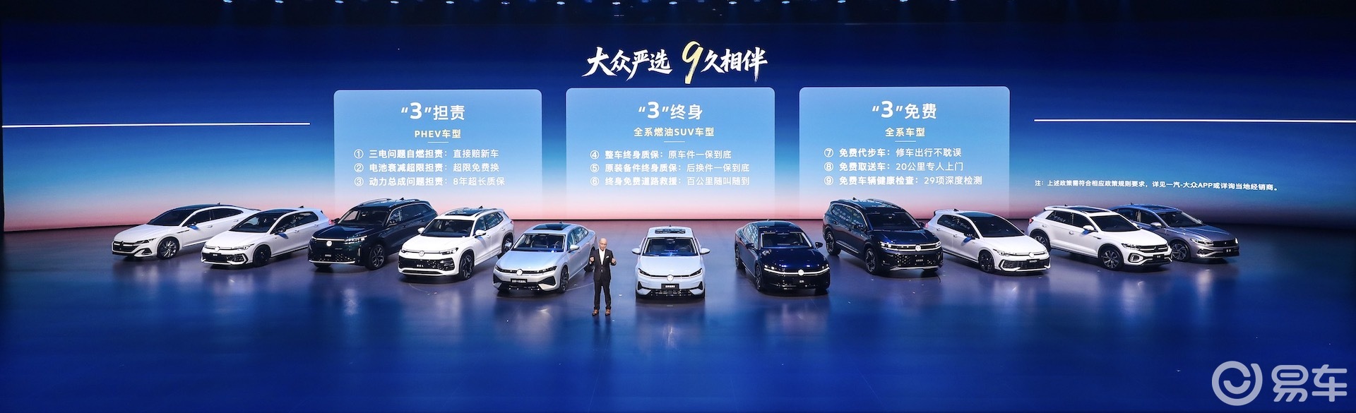 产品矩阵全面升级的同时,一汽-大众更在服务层面打出了重磅组合拳,正式推出“大众严选 9久相伴”专属承诺,以“三担责、三终身、三免费”九大权益,覆盖用户用车全生命周期。