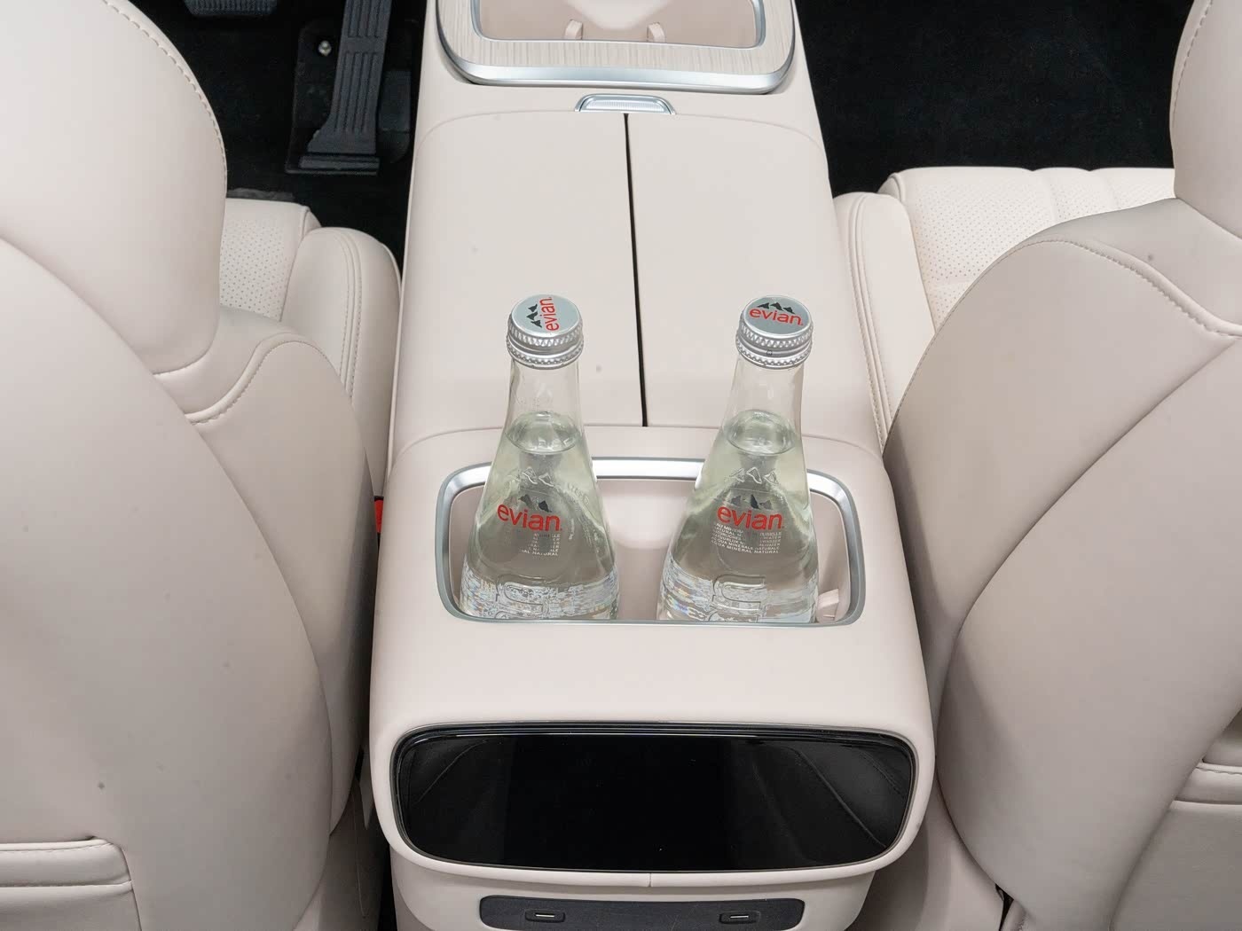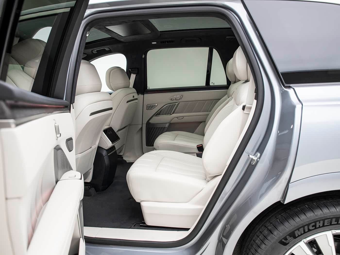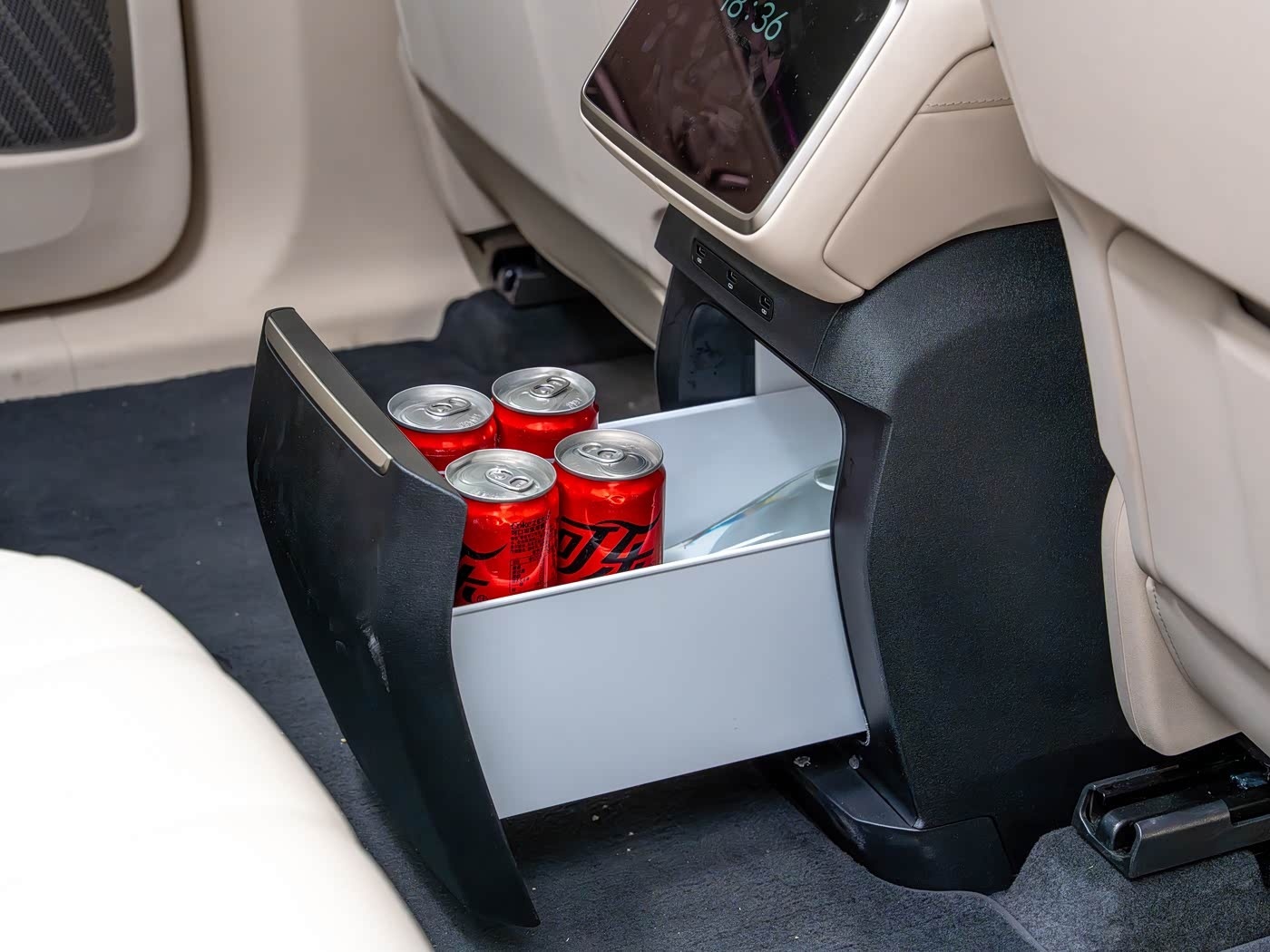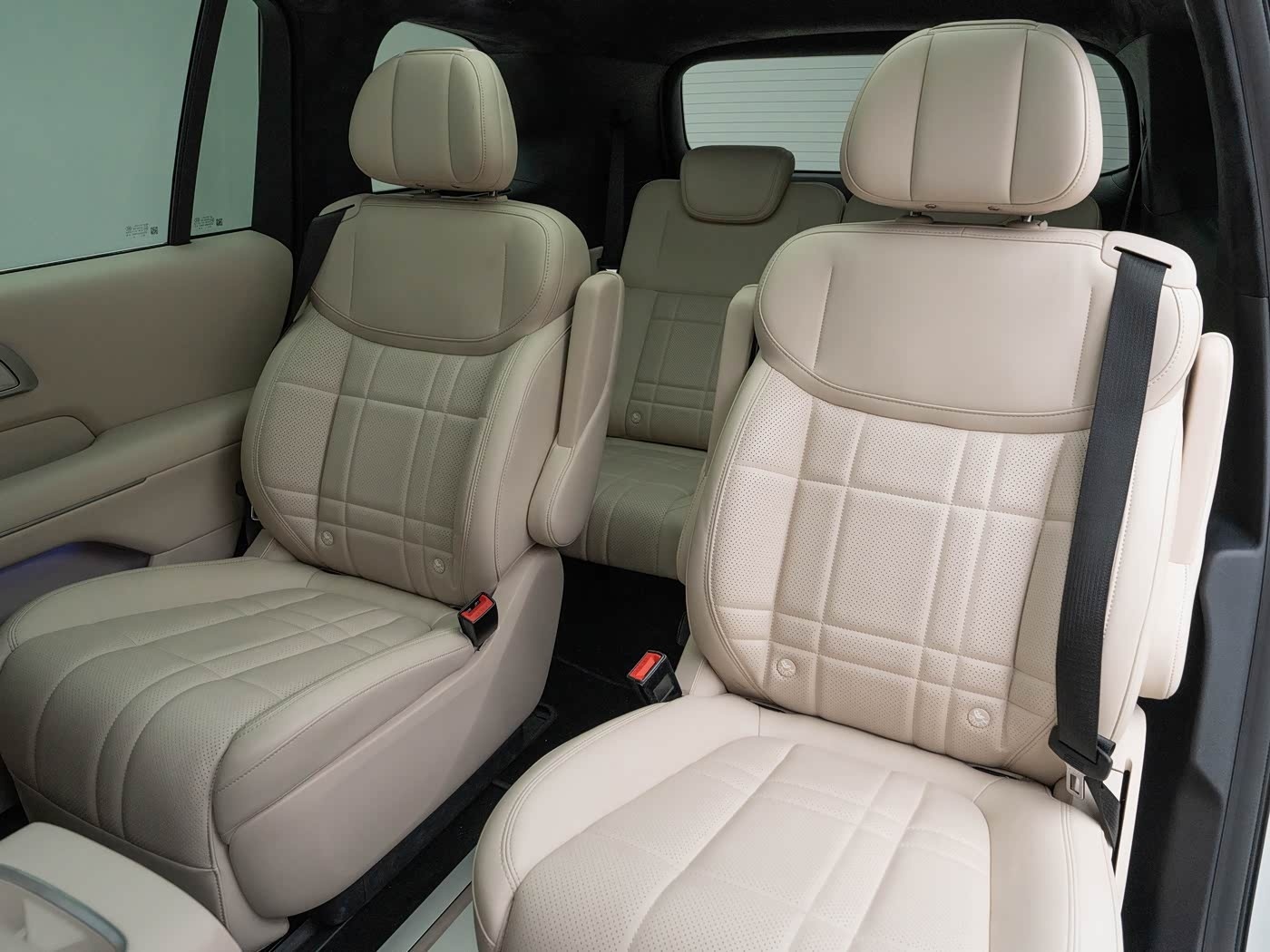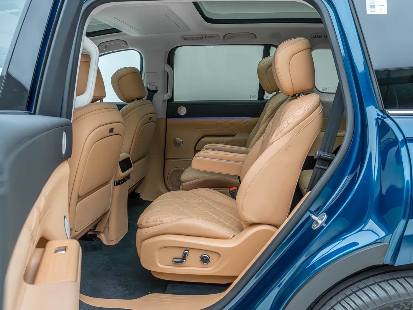首先尺寸同样很顶,长宽高5205x1996x1800mm、轴距3105mm,车内也是六座布局,三排都带电动调节,前两排加热、通风、按摩、记忆功能,还有第三排座椅加热也都是从次低配开始才有,但小桌板、后排3K分辨率21.4英寸屏幕、前后排多层隔音玻璃都是标配,而且除了入门配置都带有魔毯智能悬挂,另外它还创新设计了移动中岛,就是扶手箱位置可以前后滑动,搭配冰箱确实很实用。