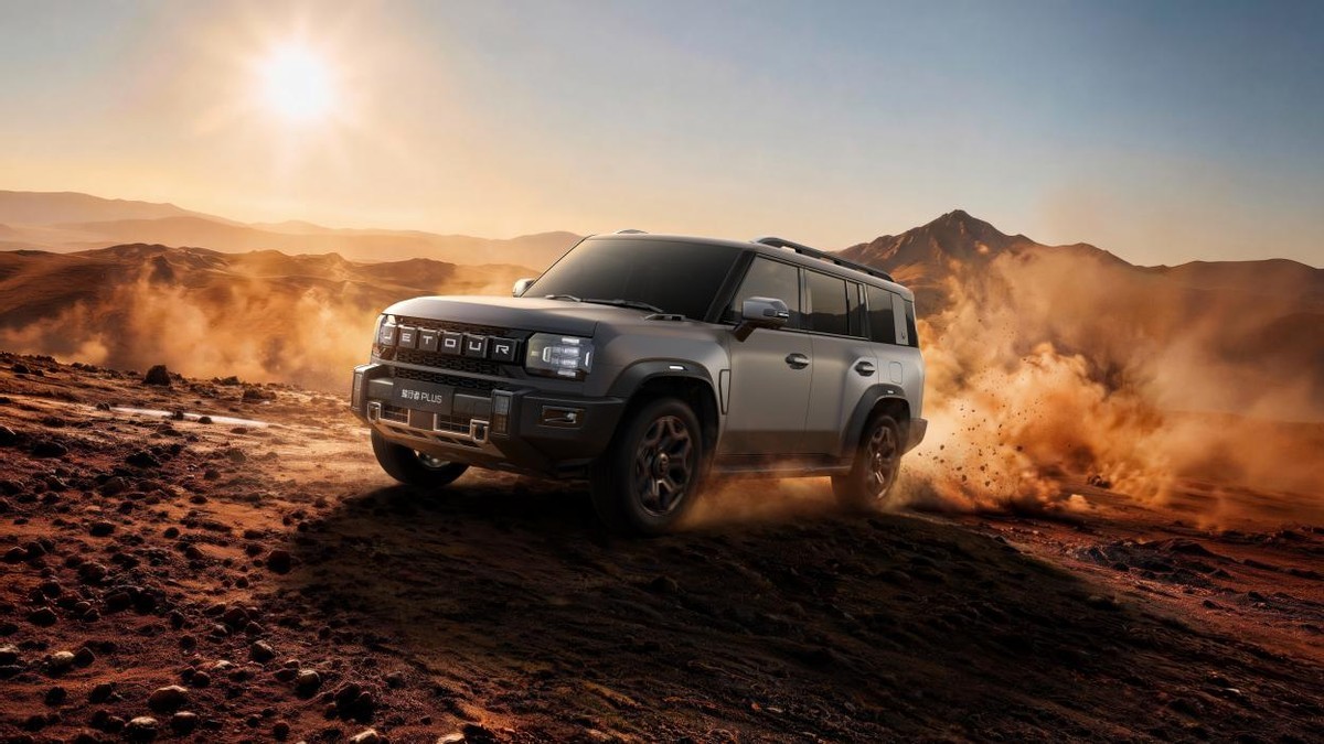 新车延续家族硬派方盒设计语言,整体造型方正硬朗,气场十足。前脸配备 JETOUR 光影立体格栅,搭配纵横矩阵式 LED 大灯,点亮后辨识度拉满;粗壮黑色下包围强化越野属性。侧面线条平直舒展,车宽超 2 米,外扩轮眉搭配 140mm 加宽防滑踏板,标配 20 英寸哑光轮圈,硬派气质凸显。车顶搭载 64 英寸全景天窗,尾部保留经典外挂式 “小书包” 备胎,直瀑贯穿式尾灯与魔术电吸尾门,兼顾硬派风格与精致感。