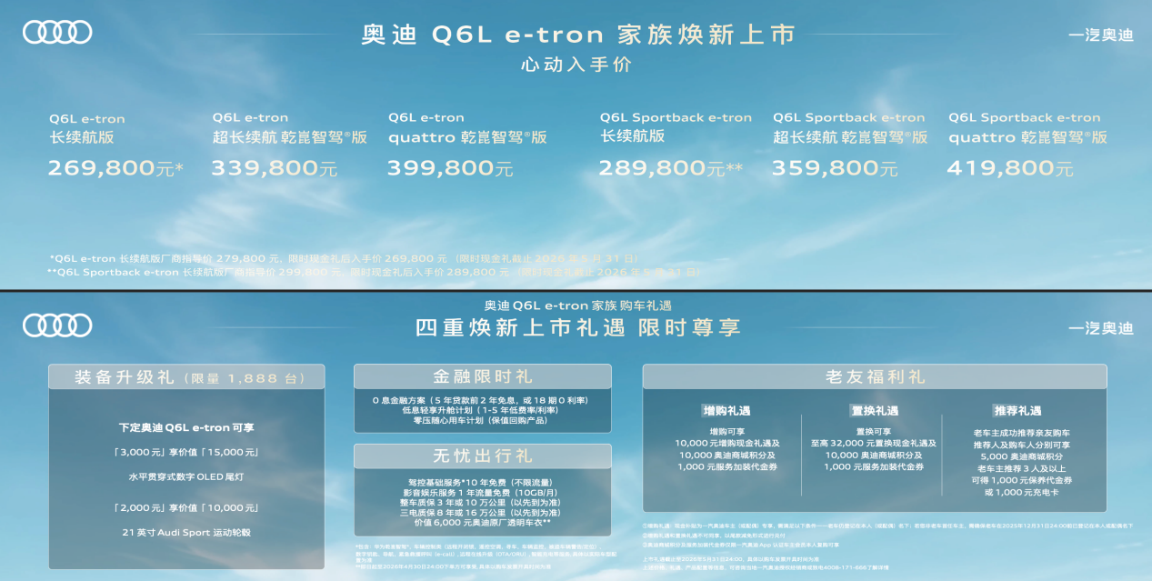 为回馈广大用户,一汽奥迪为两款新车推出多重限时尊享权益,持续至2026年5月31日。奥迪Q6L e-tron家族提供限量装备升级、金融免息、置换增购补贴、无忧出行等四重礼遇,限量1888台装备升级包可超值选装OLED尾灯与21英寸运动轮毂,置换用户可享至高32000元现金补贴,增购用户可享10000元现金支持,同时提供10年免费基础流量、超长三电质保等权益,4月30日前订车还可获赠原厂透明车衣。奥迪A6L e-tron前888位订购首发乾崑智驾版用户可享至高45000元装备升级礼,同步提供金融免息、老友专属补贴、推荐有礼等多重福利,全面降低用户购车与用车成本。