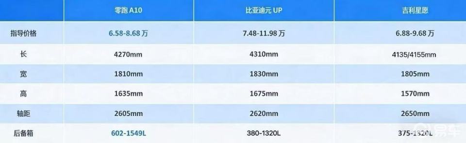 零跑A10以“顶配8.68万+505km续航+激光雷达”的高配置,很好的打破了同级市场的竞争格局,对于预算卡在10万红线内、追求高性价比的消费者来说,这三款车到底该选哪款?今天我们将零跑A10与吉利星愿、比亚迪元UP进行全方位对比,从价格权益、动力续航、智能配置到空间表现,逐一拆解,告诉你如何选才不踩坑。