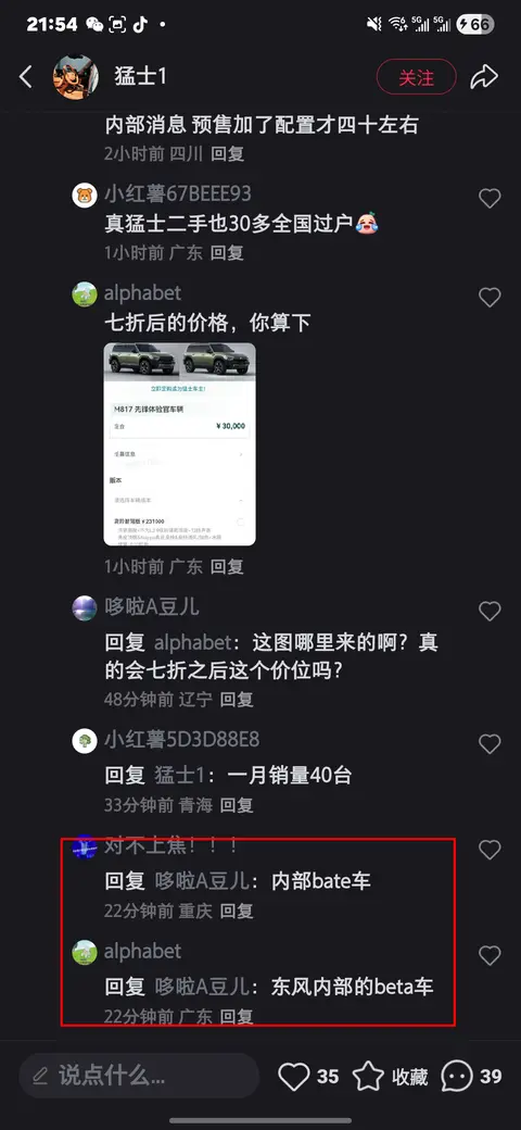 这是一张疑似东风猛士内部订车APP页面,爆料人称APP中车辆为东风内部的Beta车,所谓Beta车为非正式量产交付车辆,而APP中的价格是打了7折后的价格,角师傅算了一下,0.7x=251900元,那么原价就是36万元。