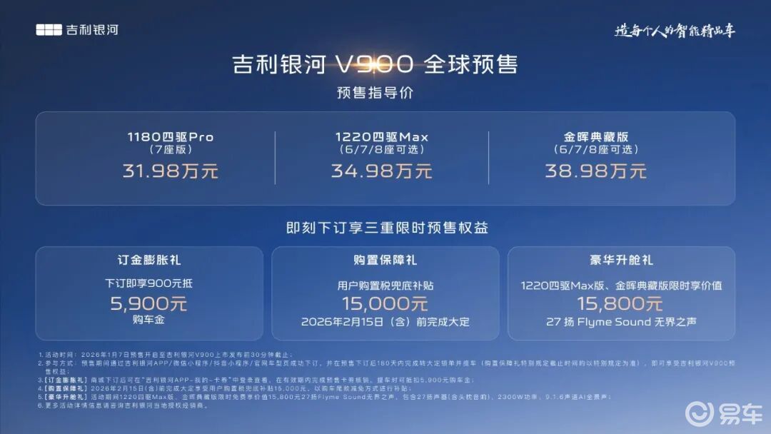 1月7日,吉利银河旗下V系列的首发之作,“AI全场景家庭旗舰MPV”——吉利银河V900正式开启预售,共计3个版本,预售指导价格区间为31.98万元~38.98万元。新车围绕中国大家庭出行的真实需求,以宽奢空间、豪华驾控、全维安全、AI智能几大全能满配实力,重新定义豪华旗舰MPV价值标准,树立AI全场景豪华出行新高度。
