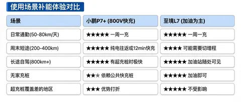各有千秋。P7+沿途有超充桩的话,补能效率极高。至境L7不用管充电桩,加油走人更省心。